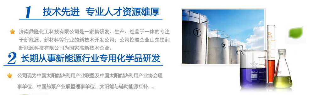 濟南鼎隆化工科技有限公司是一家集研發(fā)、生產(chǎn)、經(jīng)營于一體的專注于新能源、新材料等行業(yè)的新技術(shù)開發(fā)公司;公司控股企業(yè)山東鉑潤新能源科技有限公司為國家高新技術(shù)企業(yè)。擁有雄厚的科研實力和專業(yè)銷售隊伍以及多名從事化學化工專業(yè)的高素質(zhì)人員,其中博士生導師1人,碩士研究生3人。公司現(xiàn)為中國太陽能熱利用產(chǎn)業(yè)聯(lián)盟及中國太陽能熱利用產(chǎn)業(yè)協(xié)會理事單位、中國熱泵產(chǎn)業(yè)聯(lián)盟理事單位、山東清潔能源供暖產(chǎn)業(yè)聯(lián)盟理事單位、太陽能與輔助能源互補供熱/制冷工程專業(yè)委員會會員單位。公司專注于綠色科技,專業(yè)化研發(fā)環(huán)境友好型化工產(chǎn)品,與眾多高校和國內(nèi)外多家著名化學品公司保持戰(zhàn)略合作關(guān)系。公司擁有“載能”和“澤能”...更多